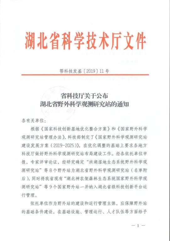 近日,湖北省科技廳公布了《省科技廳關于公布湖北省野外科學觀測研究站的通知》(鄂科技發基[2019]11號),由我校聯合湖北工業大學大學、中國長江三峽集團有限公司申報的“三峽水庫生態系統湖北省野外科學觀測研究站(以下簡稱“三峽生態站”)”獲批立項建設,我校是此次入圍的8家依托單位中的唯一省屬高校。
