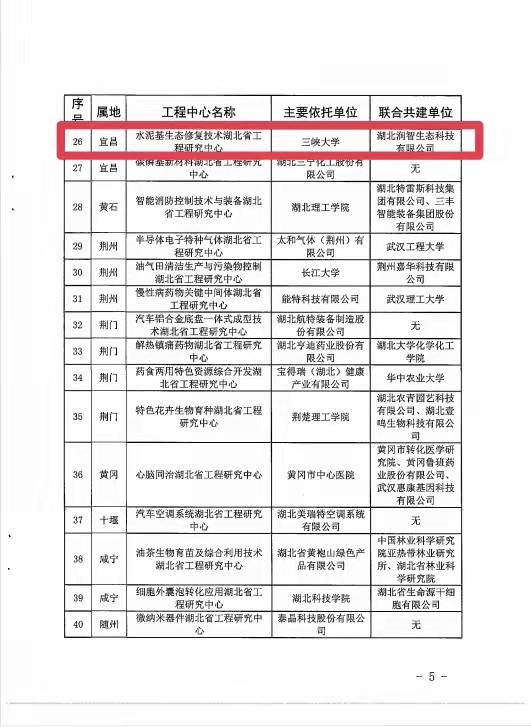 湖北省發展和改革委員會下發《省發改委關于公布2021年湖北省工程研究中心認定名單的通知》(鄂發改高技〔2021〕394號),湖北潤智生態科技有限公司和三峽大學聯合申報的“水泥基生態修復技術湖北省工程研究中心”獲批認定。